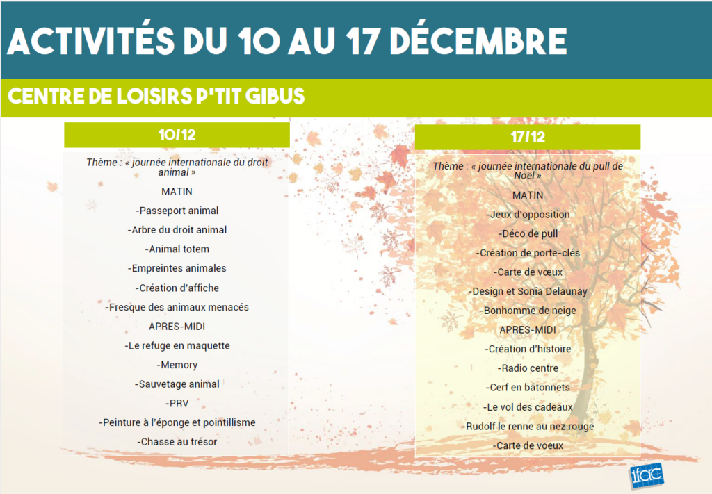 Du 5 novembre au 17 décembre, le centre de loisirs P’tit Gibus proposera aux enfants une belle série d’activités variées pour rythmer les mercredis. Entre jeux sportifs, ateliers manuels et jeux d’expression, chaque journée sera l’occasion de découvrir, de s’amuser et de partager de bons moments ensemble. Plusieurs journées à thème viendront également ponctuer cette période : nous célébrerons la journée mondiale de la gentillesse à travers des activités autour du respect et de l’entraide, puis la journée mondiale du jeu vidéo, avec des animations inspirées de l’univers vidéoludique. Nous vivrons aussi la journée mondiale des personnes en situation de handicap, où les enfants pourront expérimenter le cécifoot, le handisport et participer à des ateliers de sensibilisation. Enfin, nous mettrons à l’honneur la journée internationale du droit animal et, pour terminer cette belle période, la journée du pull de Noël, au cours de laquelle un grand défilé du meilleur pull viendra clôturer les mercredis dans la bonne humeur et la convivialité.